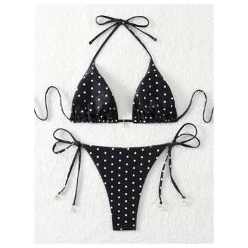 Show more Introducing the SOLY HUX Women's Polka Dots Print Bathing Suit Halter Triangle Tie Side Bikini Sets, the ultimate swimwear choice for style-savvy women who appreciate both comfort and fashion. This two-piece swimsuit combines a classic polka dot design with contemporary elements, making it a standout piece for your summer wardrobe. Crafted from a soft and stretchy fabric, this bikini ensures a comfortable fit, allowing you to enjoy all your beach activities without a hitch. The halter triangle top is designed for adjustable style, while the tie-side thongs provide a customizable fit that complements every body shape.