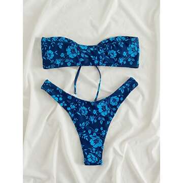 SOLY HUX Women's Print Bandeau Top and Tie Side Bikini Set 2 Piece Swimsuits Blue Floral L