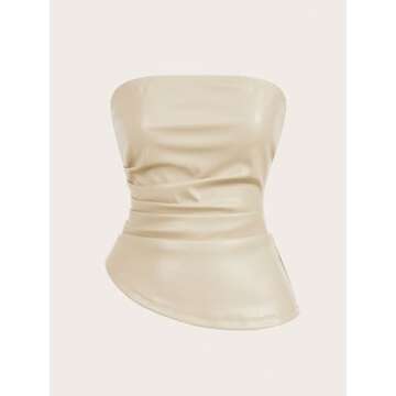 Show moreIntroducing the SOLY HUX Women's PU Leather Tube Top, a unique blend of style and comfort that's perfect for the modern woman looking to make a statement. This strapless, asymmetrical bandeau offers a chic ruched design that flatters any figure. Made from a soft, stretchy faux leather fabric, it ensures you stay comfortable whether you’re dancing the night away or enjoying a casual outing. The slim fit design complements high-waisted shorts, skirts, and jeans, making it a versatile addition to your wardrobe. In a delightful pure apricot hue, this tube top exudes a fresh and fun vibe that highlights your individuality.