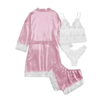 SOLY HUX Women's Satin Pajama Set 4pcs Floral Lace Trim Cami Lingerie Sleepwear with Robe Plain Pink S