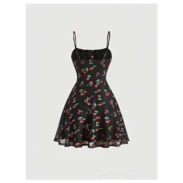 Show more Introducing the SOLY HUX Women's Summer Cute Vintage Cherry Print A Line Flowy Tea Party Mini Cami Dress, the perfect blend of style and comfort designed for those warm sunny days. This delightful mini dress is crafted from a soft and lightweight fabric that offers a stretchable fit, ensuring you feel as good as you look. The enchanting black cherry print adds a flirty touch, making it an ideal choice for summer outings or casual get-togethers. With its flattering design featuring a ruched bust, high-waisted silhouette, and whimsical spaghetti straps, this dress effortlessly accentuates your figure while keeping things playful and chic.
