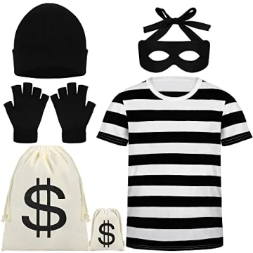 Show more Step into the limelight this Halloween with the SOMSOC Adult Halloween Robber Costume Set—a complete package tailored for the aspiring pirate or burglar looking to make a statement. Each set includes an eye-catching black and white striped short-sleeve T-shirt, complemented by practical accessories such as a beanie cap, half-finger gloves, and iconic dollar sign money bags. Whether you're planning to join in on a spooky Halloween festivity or engage in a playful cosplay scenario, this comprehensive set offers everything you need to transform into the perfect robber.