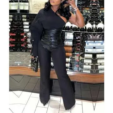 SOMTHRON Women's Faux Leather 2 Piece Outfits Bodycon One Shoulder Crop Tops and Wide Leg Patchwork Long Pants Set BL-L