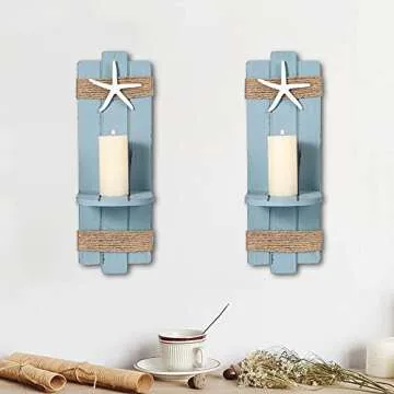 Show moreTransform your living space into a serene beachside oasis with the SOMTO Beach Starfish Wall Candle Sconces Decor. This exquisite set of ocean-themed wall-mount candle holders seamlessly blends vintage charm with a chic coastal twist, making them perfect for enhancing any room's decor. Crafted specifically from solid wood and enhanced with beautiful hemp rope accents, these candle sconces radiate a unique starfish motif that speaks to beach lovers. Imagine the elegance of candlelight dancing across your walls, creating a warm and inviting atmosphere that's reminiscent of lazy summer days by the sea.