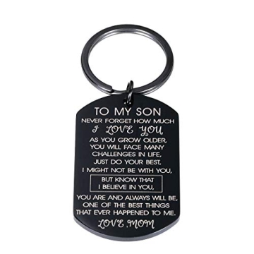 Show moreThis exquisite keychain, lovingly crafted by a dedicated brand, serves as a heartfelt token for sons of all ages. Featuring an inspirational message that resonates deeply, the pendant reads: 'To my son, never forget how much I love you. As you grow older, you will face many challenges in life. Just do your best. I might not be with you, but know that I believe in you. You are and always will be one of the best things that ever happened to me. Love, Mom.' This thoughtful gift encapsulates the nurturing spirit of a mother's love, ensuring your son knows he is cherished and supported throughout his journey.