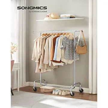 Introducing the SONGMICS Clothes Rack with Wheels—an innovative storage solution that combines strength, versatility, and convenience in one stylish design. Crafted from heavy-duty 1 mm thick steel tubes, this garment rack is engineered to support an impressive load capacity of 286.6 lb, making it the perfect storage solution for your heavy coats, jackets, and more. Its sleek chrome-plated finish not only adds aesthetic appeal but also ensures durability...