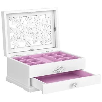 Show more Discover the elegance and functionality of the SONGMICS Jewelry Box, a beautifully designed 2-tier jewelry organizer that combines exquisite craftsmanship with practical storage solutions. Adorned with delicate flower carvings and finished with a stunning crystal knob, this jewelry box is not just a practical keeper of your treasures; it is a statement piece that enhances any vanity. With its soft velvet lining and a protective glass top, it keeps all your precious pieces safe from dust, scratches, and tangles. The quality craftsmanship ensures that this jewelry box will be a cherished item for years to come.