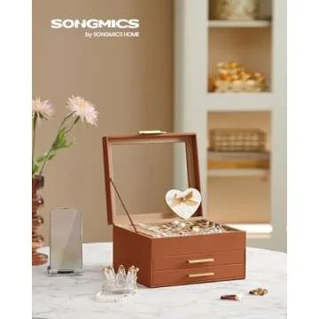 SONGMICS Jewelry Box with Glass Lid, 3-Layer Jewelry Organizer, 2 Drawers, for Big and Small Jewelry, Jewelry Storage, Modern Style, 8 x 9.1 x 5.3 Inches, Caramel Brown and Gold Color UJBC239K01