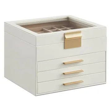 Show moreElevate your jewelry storage with the SONGMICS Jewelry Box, a modern and stylish solution for keeping your precious accessories organized and protected. This 4-layer jewelry organizer boasts a clear glass lid, allowing you to view your collection at a glance while keeping dust at bay. The top layer is designed with various slots for small pieces, while the bottom three drawers accommodate larger items, ensuring everything has its place. Crafted from quality PU and sturdy MDF, this jewelry case features elegant white and gold colors, shiny metal handles, and a soft velvet lining for a chic and durable finish. Its neat stitching and original design make it not just a storage solution but a decorative piece that enhances any dresser or cloakroom.