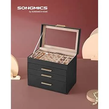 SONGMICS Jewelry Box with Glass Lid, 4-Layer Jewelry Organizer, 3 Drawers, for Sunglasses, Big Jewelry, Jewelry Storage, Modern Style, Graphite Black and Gold Color UJBC161B02