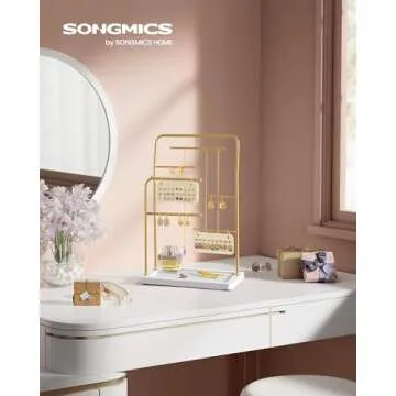 SONGMICS Jewelry Stand, Jewelry Organizer, Jewelry Display Holder with Metal Frame, 2 Earring Boards, 6 Hanging Rods, Necklace Earring Bracelet Holder, for Rings, Metallic Gold UJJS024A01