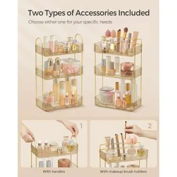 SONGMICS Makeup Organizer, 3-Tier Skincare Organizer Countertop, Customizable, 2 Types of Accessories, Jewelry Holder, for Vanity, Bedroom, Bathroom, Champagne Gold UJKA013A01