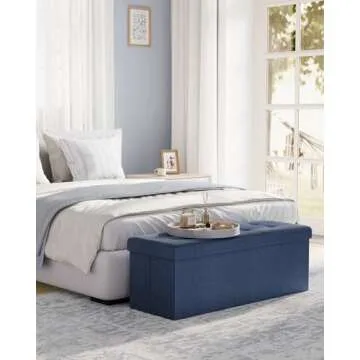 Show moreIntroducing the SONGMICS MAZIE Collection 43-Inch Folding Storage Ottoman Bench, the ultimate solution for organizing your space without sacrificing style. This versatile piece is not just a storage box; it's a chic footstool, a coffee table, and a comfortable bench, all rolled into one. With a sophisticated midnight blue hue and elegant tufted design, it adds a modern touch to any living room, bedroom, entryway, or dressing room. Constructed from premium MDF panels and reinforced with metal corner guards, this ottoman is built to last and can support up to 660 lb (300 kg) of weight, making it an essential addition to your home.