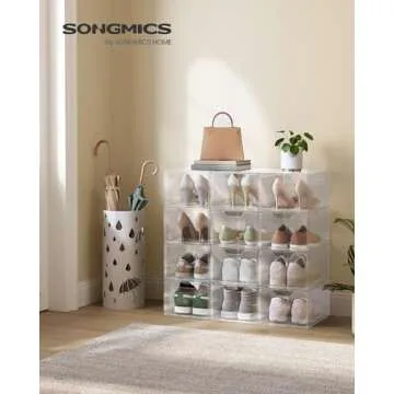 Show more Transform your shoe organization experience with this remarkable set of 12 transparent white shoe boxes, designed to bring elegance and efficiency to your space. No longer will you face mornings wrestling with mismatched boxes in a cluttered closet. With these sleek organizers, display your shoes beautifully while ensuring they are easily accessible. Each box features a front opening that allows you to grab your desired pair without rummaging through stacks, making it the perfect solution for the busy individual.