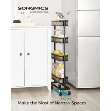 Show moreTransform Your Space with the SONGMICS Slim Storage Cart - A brilliant solution to maximize your home's organization, the SONGMICS Slim Storage Cart is 5.3'' wide, perfectly designed to fit into the smallest of spaces without compromising on utility. Whether you need extra storage for the kitchen, bathroom, laundry room, or even the garage, this 4-tier rolling cart is your go-to product! With sleek black metal construction, it not only delivers exceptional functionality but also adds a touch of elegance to any room.