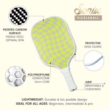 Show moreElevate your pickleball experience with the Sonix Pickleball Set, a delightful fusion of style and performance! Featuring the vibrant Checkmate Chartreuse Green design, these paddles are not only visually appealing but also engineered for optimal play. Each paddle showcases a durable fiberglass surface paired with a honeycomb polypropylene core, ensuring a perfect balance of weight and power. Whether you’re partaking in a fun day out with friends or engaging in a fierce tournament, this set is the ultimate choice for both casual and competitive players.