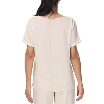 Soojun Women's Cotton Linen Round Collar Boxy Top Patchwork Blouses