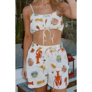The set includes a chic camisole with a tie front feature and high-waisted shorts, both designed to give you a flattering silhouette. The sleeveless and backless style accentuates your figure while allowing for ease of movement. The unique lobster print adds a whimsical touch, making it a stand-out piece for any wardrobe.