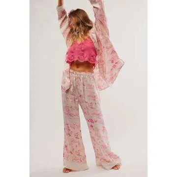 SOOKABEILA Womens Y2k Silk Pajama Sets Floral Print Long Sleeve Button Down Shirts Wide Leg Pants 2 Piece Lounge Sets (Pink,M)