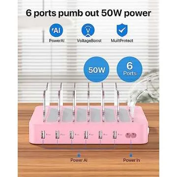 Show moreIntroducing the SooPii Premium 6-Port USB Charging Station Organizer, your ultimate solution for a clutter-free charging experience! This versatile charging station is designed to accommodate all your devices, featuring an impressive power output of 50W/ 10A across six ports, which ensures the fastest and most efficient charging for your smartphones, tablets, AirPods, and even smartwatches. With SooPii's proprietary PowerAI and VoltageBoost technology, you can trust that your devices are receiving optimal power no matter what. Say goodbye to tangled cables and messy chargers—your workspace will never look better!