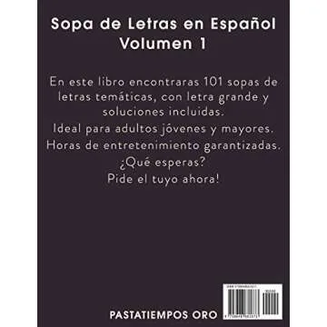 Show more Descubre la diversión y el desafío de las sopas de letras con el Volumen 1 de Sopa de Letras en Español. Este libro es una colección para adultos y adultos mayores, diseñada con letras grandes para facilitar la lectura y disfrutar de cada palabra. Contiene un total de 101 sopas de letras temáticas que no solo estimularán tu mente, sino que también te transportarán a diversos temas interesantes, desde la naturaleza hasta la cultura, ¡todo en un solo lugar! Y no te preocupes por quedarte atascado, ya que cada actividad está acompañada de soluciones para que puedas verificar tus respuestas al instante.