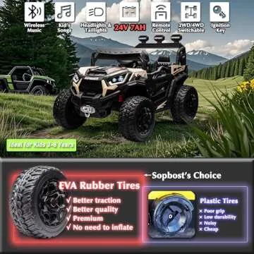 Why You Will Love This Product: The sopbost 24V Ride On Kids UTV isn’t just a toy - it’s an opportunity for your kids to build confidence, experience the joy of freedom, and ignite their imaginations in a safe environment. The thrill of driving through various terrains with friends or siblings while enjoying their favorite music creates unforgettable childhood memories that will be cherished for a lifetime.