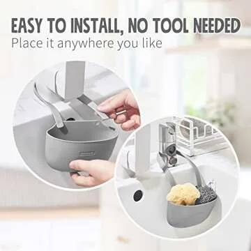 Show more Introducing the ultimate kitchen companion, this unique sponges and soap holder transforms your sink area into a neat and tidy space. Crafted with a focus on convenience and style, this holder is designed to keep your kitchen essentials organized without taking up much room. The holder attaches easily around your faucet without suction cups or adhesives, ensuring no mess and no hassle. Its durable plastic material is resistant to rust and ensures longevity, making it a practical choice for any kitchen.