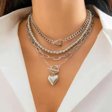 Sora Tuki Layered Necklace Silver Heart Necklaces for Women Chunky Silver Necklace Trendy Big Heart Pendant Necklace Puffy Heart Necklace Large Heart Necklace Silver Chunky Jewelry