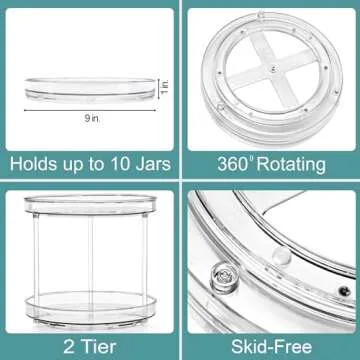 Show more Introducing the Sorbus Clear Lazy Susan Organizer, a game-changer in home organization designed to elevate your room's functionality while enhancing its aesthetic appeal. Made from premium quality plastic, this lazy susan promises unmatched durability that outlasts many alternatives on the market. It's perfect for decluttering your refrigerator, kitchen pantry, or even your bathroom, ensuring that every item has its place.