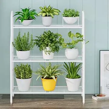 Show more Meet the SORCEDAS Plant Stand, your perfect partner for showcasing your beloved plants and saving valuable space in your home or garden! With a generous size of 28.03"L x 9.61"W x 32.22"H, this innovative 3-tier metal corner plant shelf can accommodate over 9 pots of flowers, transforming any corner into a lush sanctuary. Made entirely from 100% iron, it features a sleek white finish with waterproof and anti-rust spray paint, ensuring that it remains both stylish and durable for years to come, whether indoors or outdoors. Elevate your gardening game with SORCEDAS!