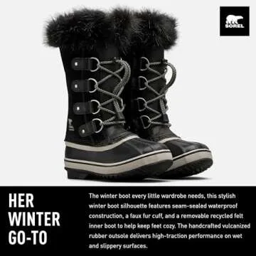 Show moreIntroducing the Sorel Youth Unisex Youth Joan of Arctic Waterproof Boots – the perfect blend of style, comfort, and protection for active kids. Crafted to withstand the chilly elements, these boots feature a water and wind resistant synthetic fabric upper, ensuring little feet stay warm and dry during winter adventures. With an injection molded waterproof thermal rubber shell, these boots deliver optimal thermal insulation, making them ideal for snowy climates and slushy conditions.