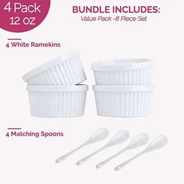 Souffle Dish Ramekins for Baking – 12 Ounce (Set of 4, White with 4 Extra Spoons) 12 Oz Ceramic Oven Safe Round Fluted Ramekin Bowl for Desserts Soups Snacks Quiche Appetizers Casserole Creme Brulee