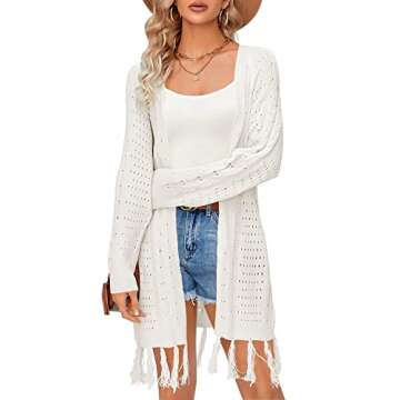 Show moreIntroducing the Soulomelody Msikiver Womens Boho Cardigan Sweaters, a stunning blend of comfort and style that embodies free-spirited elegance. This exquisite crochet hollow-out open front shawl is designed for modern women who appreciate unique fashion statements. Crafted with care, the lightweight knit fabric offers breathability, making it ideal for layering, while the beautiful tassel details add a playful twist to your outfit. Available in a crisp white hue, this cardigan is versatile enough to complement any wardrobe, transitioning effortlessly between seasons and occasions.
