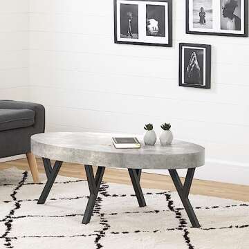 Show moreIntroducing the **South Shore City Life Coffee Table in Concrete Gray and Black**, where industrial design meets modern functionality. This striking coffee table features a sophisticated blend of a thick oval surface and robust metal legs, making it a stylish centerpiece for your living space. Perfect for cozy TV nights, its large surface lets you keep snacks and drinks conveniently within arm's reach. The sturdy construction, highlighted by four angled metal legs, ensures maximum stability, allowing you to relax without any worries about it tipping over. Plus, with a waterproof finish, you can easily wipe away spills, making it as practical as it is stylish.