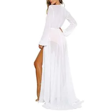 Show moreIntroducing the Sovoyontee Women's White Sexy Kimono Long Sleeve Swimsuit Swim Bathing Beach Cover Up Dress—the perfect blend of elegance and functionality for your beach outings and poolside lounging. This stunning floor-length swim maxi cover-up features long sleeves and a plunge front opening, allowing for easy wear and a charming silhouette. Its delicate tie waist sash adds a flattering touch that enhances your curves, ensuring you feel confident and chic.