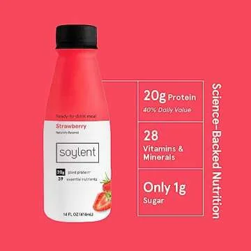 ... Show more Soylent's Completely Nutritious Meal Replacement Drinks offer a perfect solution for anyone seeking a convenient and balanced meal option. Infused with a nostalgic strawberry milk flavor, these nutrition shakes are not only protein-packed but also low in sugar, making them a delightful way to stay full and nourished throughout the day. Each shake is designed to provide a perfect blend of proteins, fats, and carbs, ensuring you get the essential nutrients your body requires.