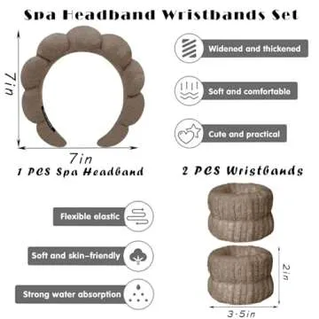 Spa Headbands for Washing Face Wristband Set Sponge Makeup Skincare Headband Wrist Towels Bubble Soft Terry Towel Cloth Hairband for Women Puffy Headwear Non Slip Thick Thin Hair Headwear (Brown)