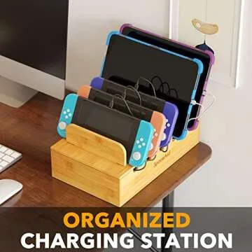 SpaceAid Bamboo Charging Station for Multiple Devices, Cell Phone Docking Stations for Multi Laptop, Tablets and iPads, Nightstand Bedside Desk Device Charger Organizer (Natural)