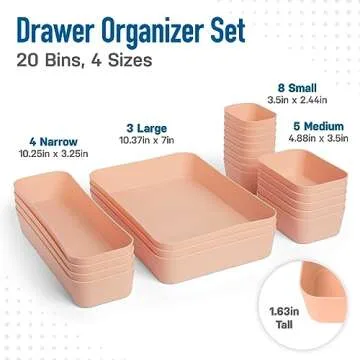 The ultimate solution to organized living has arrived with our Spacesaver Drawer Organizer Set. This comprehensive set features 20 versatile bins, consisting of 3 large, 4 long narrow, 5 medium, and 8 small bins. Perfectly tailored to address your storage needs, this set is a must-have for every home or office.