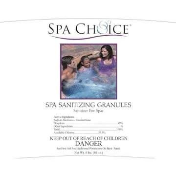 Show moreWelcome to the world of effortless spa maintenance with SpaChoice 5-Pounds Premium Spa Sanitizing Granules. Designed specifically for hot tubs and spas, these premium chlorine granules ensure that your water remains clean, clear, and inviting. With an initial dosage of just 6 teaspoons for every 500 gallons, keeping your spa in top condition has never been easier. Each teaspoon of this powerful formula delivers approximately 1.4 parts per million (ppm) of available chlorine, effectively sanitizing your water and creating a safe environment for relaxation. Manufactured in the USA, SpaChoice guarantees quality and reliability, making it your ultimate choice for spa sanitation.