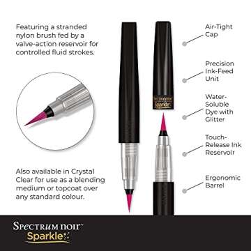 Unlike traditional glitter markers that can lead to messy workspace fix-ups, Spectrum Noir’s Sparkle markers offer a fine, flexible brush tip, allowing for an ultra-clean application. Competitor brands often lag in pigment richness, falling short of the vibrant hues provided by Spectrum Noir. The inclusion of a Crystal Clear overlay distinguishes this product, enabling users to create dazzling transparency and shine not commonly found among competitors. This innovative approach guarantees a professional finish that keeps your artistry elevated and your workspace tidy.