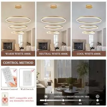 Show more Transform your living space with the exquisite Dimmable 3-Ring Chandelier. This stunning chandelier offers more than just illumination; it creates an ambiance that captivates the senses. Designed with an elegant gold shade, this chandelier features a modern aesthetic with three rings that can be adjusted for height and shape, making it a versatile addition to any room. The ability to control the color temperature from 3000k warm white to 6500k cool white means you can cater the lighting to your mood and needs, whether hosting a formal dinner or enjoying a cozy night in.