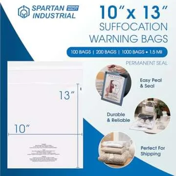 Spartan Industrial - 10” X 13” (100 Count) Self Seal Clear Poly Bags with Suffocation Warning for Packaging, T Shirts - Permanent Adhesive
