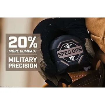 Show moreIntroducing the Spec Ops Tools 16-Foot Tape Measure – engineered for precision, built for durability. This tape measure stands out with its military-grade composite housing, ensuring it withstands the toughest working conditions while being compact and lightweight. The unique MIL-X coating provides up to 20% more compactness compared to standard options, making it not only resilient but also perfect for easy carrying and storage. Designed with a high-visibility white blade that features double-sided markings, it allows you to take clear and accurate measurements from any angle, so you can work efficiently without the hassle of poor visibility.