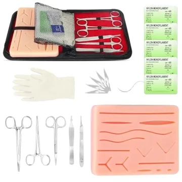 The upgraded tear-resistant mesh suture pad (240g) significantly outperforms standard 170g options, providing you with a resilient practice surface designed for thorough hands-on experience. Notably, this kit comes with an innovative silicone skin that mimics real-life textures complete with 14 simulated wounds, allowing you to make personalized incisions that reflect true surgical scenarios. This realistic setup not only enhances your suturing techniques but also instills a sense of confidence in a safe learning environment.