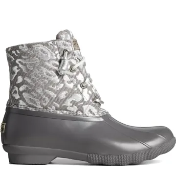 Show moreIntroducing the Sperry Women’s Saltwater Seasonal Rain Boot in a stunning Silver Leopard design—a perfect embodiment of versatility, style, and functionality. Made with a 100% waterproof rubber shell, these boots are designed to keep your feet dry and comfortable, no matter the weather conditions. The unique Barrel-Tied Lacing system ensures a secure fit, while the rust-proof eyelets enhance durability and ease of use. With a side zipper, you can slip them on and off with ease—making them an ideal choice for busy days or spontaneous outdoor adventures. The non-marking rubber outsole, featuring Sperry’s signature molded Wave-Siping technology, provides exceptional traction on wet and slippery surfaces which is crucial for outdoor activities.