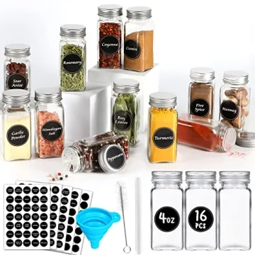 Show moreTransform your kitchen with the AuroTrends Spice Jars with Label 4oz 16Pcs set! This complete organization solution is perfect for those who seek both functionality and style in their culinary space. Designed to declutter your pantry, these square glass spice jars not only enhance the aesthetic of your kitchen but also make cooking an enjoyable experience. Say goodbye to chaotic spice cabinets and hello to a beautifully organized culinary space. Each jar is constructed from high-quality, thickened lead-free glass, ensuring durability and safety for your spices, herbs, and homemade blends.