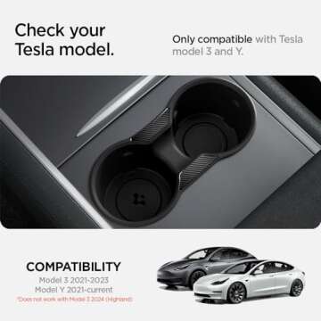 Show more Introducing the Spigen Tesla Cup Holder Insert, a must-have accessory designed specifically for Tesla Model 3 (2021-2023) and Model Y (2021-2025) owners. This innovative insert is tailored to provide a relaxed grip that accommodates various cup sizes, including the expansive Trenta cups, ensuring that your beverages stay secure during your travels. Its premium construction, featuring carbon fiber accents, not only enhances the aesthetic appeal of your vehicle's interior but also promises exceptional comfort during use.