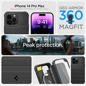 Show more The Spigen Geo Armor 360 MagFit is engineered to provide unparalleled protection for your iPhone 14 Pro Max (2022). Crafted with military-grade materials, this case offers complete 360-degree coverage, ensuring that your precious device is shielded from scratches, drops, and impacts. The seamless integration of a glass screen protector adds an extra layer of defense, while the sleek black finish exudes sophistication. The innovative design features Magnetic integration compatibility with MagSafe accessories, allowing for easy attachment and seamless wireless charging without the need to remove the case. With Spigen's extreme protection technology and Air Cushion technology strategically placed in the corners, your iPhone can endure the toughest spills, drops, and daily wear-and-tear with style.