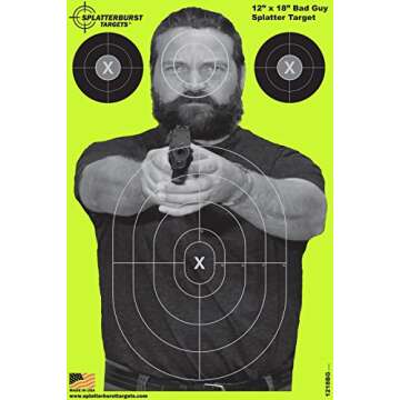 Show moreIntroducing the Splatterburst Targets - 12 x 18 inch - Bad Guy Splatter Target, the ultimate solution for shooters seeking a realistic and efficient target practice experience. Designed with visibility in mind, these targets are engineered to display bright fluorescent colors upon impact, making it easy to see your shots and enhance your shooting proficiency. Manufactured in the USA, this product comes in a convenient pack of 25, ensuring you have plenty of targets for ongoing practice. The heavy-duty non-adhesive tagboard construction guarantees that these targets withstand repeated shots, providing durability whether you're shooting indoors or outdoors.